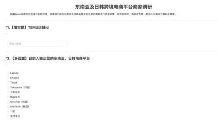 Temu本次进行东南亚日韩商家信息征集,或为进军新市场进行准备。卖家端已经收到的调研页面表示,随着Temu电商平台加速开拓新区域,现邀请已经在东南亚及日韩电商平台运营的商家填写调研问卷、提供相关信息。